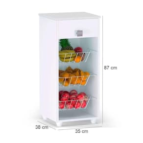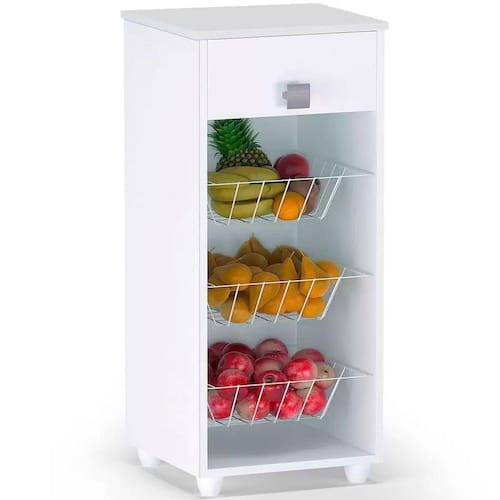Fruteira para Cozinha serve para guardar vários tipos de frutas e também pode ter espaço para legumes e outros alimentos. Compacta e fácil de combinar, a fruteira para cozinha é o móvel ideal para quem busca uma solução prática e econômica para organizar o cômodo. A Fruteira de Chão possui a estrutura em MDP de alta qualidade com acabamento em pintura UV garantindo maior durabilidade ao produto. Ela conta com 1 gaveta com corrediça telescópica e 3 cestos de ferro para armazenagem de frutas e legumes.
