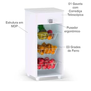 Característica da Fruteira com 3 Cestos: - Estrutura em mdp; - Pintura em UV na cor Branco Brilho; - 3 grades de ferro; - 1 gaveta com corrediças telescópicas que deslizam com facilidade; - Puxador ergonômico; - Não acompanha objetos de decoração;