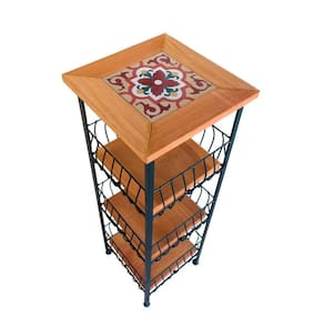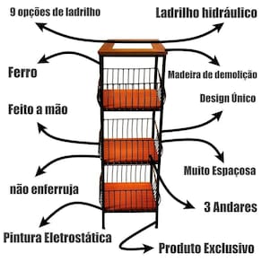 Fruteira de chão com três andares, construída por artesãos premiados, usando madeira maciça, ferro com pintura eletrostática antiferrugem e um ladrilho Hidráulico. Seu ótimo trabalho e materiais que garantem um excelente acabamento e a certeza de que irá durar muitos anos sem perder sua beleza .