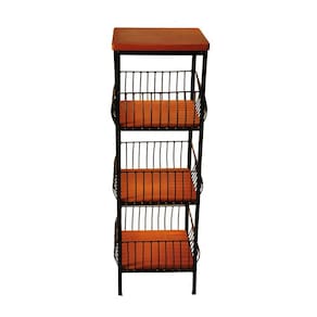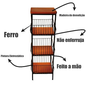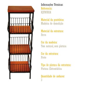 Fruteira de chão com três andares, construída por artesãos premiados, usando madeira de demolição tratada e ferro com pintura eletrostática antiferrugem. Seu ótimo trabalho e materiais que garantem um excelente acabamento e a certeza de que irá durar muitos anos sem perder sua beleza natural.