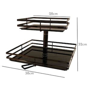 Garantia: 90 dias / Peso: 5,065kg / Cor predominante: onix / Referência: 7898032680412 Dimensões montada: 38cm (C) x 38cm (L) x 32cm (A); Dimensões prateleira maior: 38cm (C) X 38cm (L) x 3,5cm (A); Dimensões prateleira menor: 28cm (C) x 28cm (L) x 6cm (A); Altura entre as prateleiras: 15cm (A); Quantidade de prateleiras: 2; Locais de colocação: bancadas ou mesas; Materiais: aço carbono e vidro.