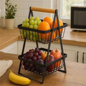 Fruteira de Metal: Organização com Estilo e PraticidadeDê um toque especial à sua cozinha com esta fruteira de metal de dois andares Com um design elegante e funcional, ela é perfeita para armazenar frutas, legumes e outros itens de forma prática e organizada.Benefícios que fazem a diferença:Material resistente - Estrutura de metal durável e estável.Dois andares espaçosos - Mais capacidade para otimizar seu espaço.Alça de madeira - Toque rústico e sofisticado para qualquer ambiente.Base com pés esféricos - Estabilidade e charme extra.Ideal para quem busca organização sem abrir mão do design moderno. Adicione mais praticidade e beleza à sua cozinha hoje mesmoEspecificações Técnicas:Cor: PretoMaterial: Metal e MadeiraMedidas Aproximadas: Altura: 32,5 cm x Largura: 18 cm x Comprimento: 30 cmImagens IlustrativasComposição da Embalagem:1 Cesta de Frutas Marca: Não Informado