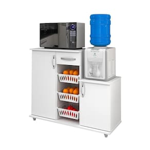 Conta com 1 gaveta espaçosa, 2 portas com prateleiras internas e cestos em PVC, ideais para armazenar frutas, legumes e utensílios do dia a dia. O tampo em MDP de 15 mm oferece resistência para acomodar eletros como micro-ondas, além de possuir espaço dedicado para bebedouro com galão de até 20 litros.