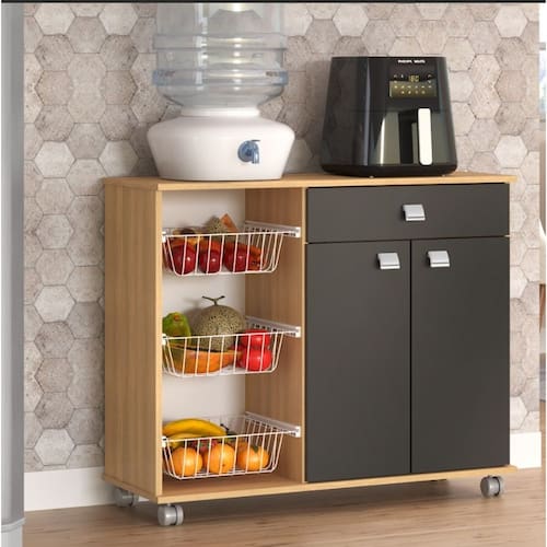 A Fruteira Isis possui 1 gaveta grande com corrediças metálicas, 2 portas com prateleira interna e 3 cestos metálicos feitos com pintura eletrostática que não encardem e não enferrujam, fáceis de limpar. Ideal para armazenamento de frutas e legumes, possui rodízios para uma melhor movimentação e facilidade de limpeza. Pode ser utilizado para áreas de cozinha. Esse móvel é ideal para pessoas que gostam de organização. Produzido em MDP conta com um design sofisticado irá harmonizar com seu ambiente de casa. Além disso, o produto possui uma fácil montagem.