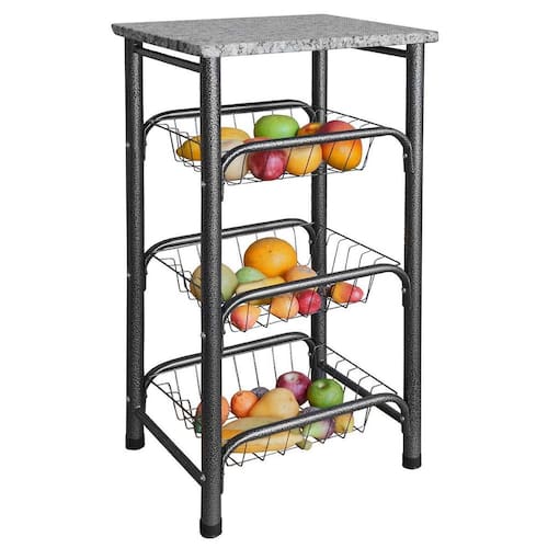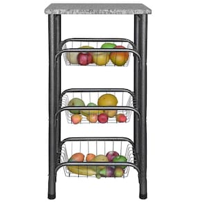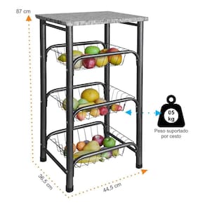 Descrição do produto: A Fruteira Munique com Tampo de Granito é ótima para sua cozinha, área de serviço ou varanda. Ela feita com estrutura em aço carbono, tem 3 cestos que facilitam o armazenamento de produtos e a limpeza, tem pintura Epóxi e proteção anti ferrugem, que dão maior durabilidade ao material. Também possui ponteiras de polipropileno nos pés, o que protege a estrutura da fruteira e evita arranhões no piso. O destaque desse produto é o tampo feito em granito, que traz maior sofisticação ao item, tornando-o parte da decoração da casa.