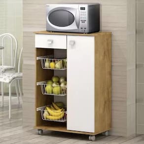 A Fruteira Natasha possui 1 gaveta com corrediças metálicas, 1 portas com prateleira interna e 3 cestos metálicos feitos com pintura eletrostática que não encardem e não enferrujam, fáceis de limpar. Ideal para armazenamento de frutas e legumes, possui rodízios para uma melhor movimentação e facilidade de limpeza. Pode ser utilizado para áreas de cozinha. Esse móvel é ideal para pessoas que gostam de organização. Produzido em mdp conta com um design sofisticado irá harmonizar com seu ambiente de casa. Além disso, o produto possui uma fácil montagem.