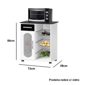 Gaveta ampla3 cestos fruteiros1 Porta com vidro frontal e 2 Nichos internosProduzido em MDPPintura UVPuxador clean cromadoRodízios