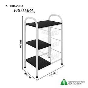 Fruteira em aço com 3 cestos, ideal para organizar frutas e legumes de forma prática e elegante. Possui dois tampos pequenos e um tampo superior maior, oferecendo versatilidade para armazenamento e decoração. Seu design robusto e funcional é perfeito para otimizar o espaço na cozinha. Acabamento: Pintura UV Acabamento da Prateleira: Pintura Texturizada UV Ambiente Principal: Cozinha Cesto para Frutas: 03 Cesto Removível: Sim Complexidade da Montagem: Baixa: pode ser montado por uma pessoa sozinha Cor: Branco/Preto Cor do Produto: Branco/Preto Escala de Brilho: Semi-Fosco Escala de Brilho da Prateleira: Semi-Brilho Itens Inclusos: 1 Fruteira + Manual de montagem + Kit ferragens Manual de Montagem e Instalação: https://product-hub-prd.madeiramadeira.com.br/938393/documents/cbed5fd3-47db-4c4b-ba69-ecd6424593452298231352817253850479874.pdf Material da Prateleira: Ardósia Material do Cesto: Aço Necessita Montagem: Sim Origem do Produto: Nacional Peso: 29,77 kg Peso Máximo por Prateleira: 5 kg Possui Pés: Não Possui Portas: Não Recomendações de Uso, Manutenção e Limpeza: Limpar com pano levemente umedecido, não utilizar solventes nem produtos de limpeza. Sapatas Niveladoras: Não Sistema de Montagem: Parafusos Suporta Até (kg): 30 kg Marca: Tubulares Paonanda