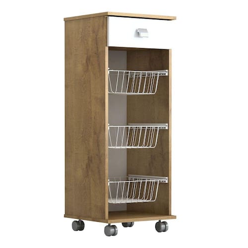 FRUTEIRA - A Fruteira Talita possui 1 gaveta com corrediças metálicas, 3 cestos metálicos feitos com pintura eletrostática que não encardem e não enferrujam, fáceis de limpar. Ideal para armazenamento de frutas e legumes, possui rodízios para uma melhor movimentação e facilidade de limpeza. Pode ser utilizado para áreas de cozinha e lavanderia. Esse móvel é ideal para pessoas que gostam de organização. Produzido em MDP conta com um design sofisticado irá harmonizar com seu ambiente de casa. Além disso, o produto possui uma fácil montagem.Altura 1,0m x Larguras 0,387m x Profundidade 0,37m\\Nao nos responsabilizamos pela montagem ou instalação do produto. Sugerimos a contratação de um serviço terceirizado de montagem ou de algum profissional experiente de sua preferencia. Nao indicamos serviço de montagem. Imagem meramente ilustrativa\\