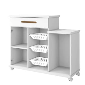 Caracter?sticas: Op??o cesto branco ou preto Frente de gaveta dupla face Tampo e base MDF 18mm Bordas arredondadas e pintadas Prateleira Interna 5 Rodizios Corredi?as Telesc?picas