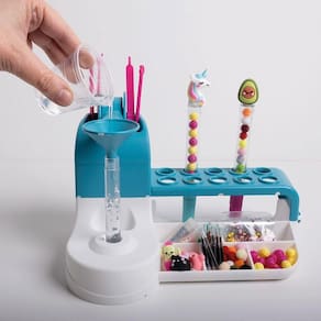 Contém: 1 Base de plástico para colocar os componentes e as criações, Funil e utensílios, Pés antiderrapantes, 10 corpos de caneta transparentes, 10 tampas brancas; 10 tampas coloridas para as caneta; 10 bicos plásticos de caneta coloridos, 12 recargas de tinta em 4 cores diferentes, 2 tubos de glitter (azul e prata), 6 saquetas de decorações iridescentes coloridas de diferentes, 40 pompons coloridos, 32 miçangas plásticas nas cores rosa pink e amarela, 10 personagens de borracha, manual de instruções.