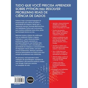 Dados são hoje um dos ativos mais importantes das empresas. Mas como lidarcom eles? Essa é a pergunta do milhão para muitos profissionais não programadores que se deparam com a necessidade de resolver problemas complexos que envolvem grande quantidade de dados. Python é hoje a principal linguagem de programação para ciência da dados e aprendizado de máquina. Neste guia, o experiente instrutor Kennedy Behrman mostra o básico da codificação com os notebooks Python e Jupyter, ambiente nº 1 para ciência de dados profissional. Apresenta ainda as principais bibliotecas, que facilitam lidar com a matemática, com a visualização, com o aprendizado de máquina e com o processamento da linguagem natural. Então, com base nesses fundamentos, Behrman apresenta técnicas intermediárias de Python para uma solução de problemas mais sofisticada.