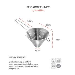 Passador Chinoy é a ferramenta essencial na cozinha profissional. Seu formato conico como funil, garante a coagem refinada de sopas, molhos e caldos, deixando-os com uma textura lisa. Produzido em aço inox de alta durabilidade, a malha fina garante uma filtragem detalhada, deixando seus pratos com acabamento profissional. Seu material de qualidade superior proporciona segurança alimentar, enquanto o formato ergonomico facilita o manuseio, tornando o processo de coar pratico e eficiente.