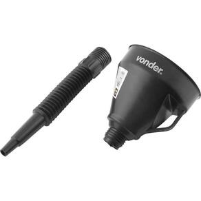 Funil plástico de alta resistência. Possui alça, peneira e haste flexível, que possibilita o uso em locais de difícil acesso para funis comuns.