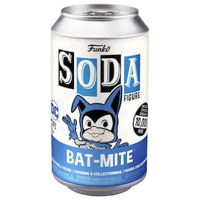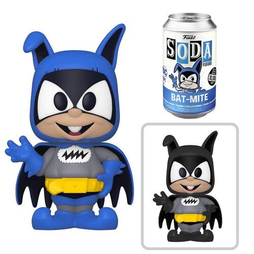 Esta figura de refrigerante de vinil de morcego da DC Comics mede aproximadamente 4 1/4 polegadas de altura. Embalado dentro de uma lata de refrigerante colecionável, inclui um cartão de colecionador em forma de "POG"