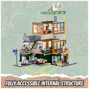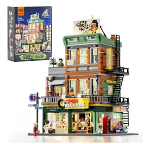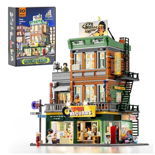 Conjunto de blocos de montar em plástico que representa uma loja de discos em ambiente urbano, com três níveis funcionais: área de venda de discos no térreo, estúdio de gravação no segundo piso e lounge para encontros e atividades musicais no terceiro andar. A fachada utiliza elementos de cultura de rua, com letreiros, vitrines e painéis decorativos associados a música e hip-hop.??