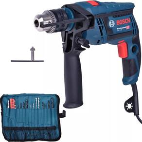 - Furadeira de Impacto Profissional Bosch GSB 13 RE 750W 220v em caixa de Papelão; - 01 Bolsa Organizadora com 23 Acessórios sendo: - 10 Pontas para aparafusar; - 04 Brocas para Concreto 4 mm, 5 mm, 6 mm e 8 mm; - 04 Brocas para Madeira 4 mm, 5 mm, 6 mm e 8 mm; - 04 Brocas para Metal 4 mm, 5 mm, 6 mm e 8 mm; - 01 Extensor Universal: - 01 Chave para Mandril; - 01 empunhadeira emborrachada; - 01 Limitador de Profundidade; - 01 Manual de Instrução; Não acompanha Maleta para Transporte