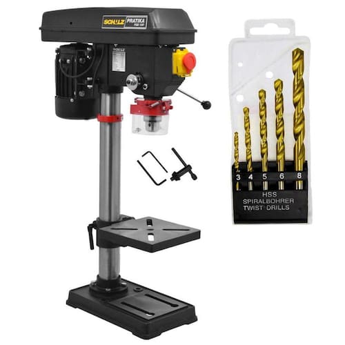 Furadeira de Bancada 5/8 POL Completa FSB 16P Pratika SCHULZ A Furadeira de Bancada Schulz é uma Furadeira Vertical Estacionária e possibilita furos firmes e com precisão. Possui um potente motor de 1/2 CV e capacidade de furar 16mm de diâmetro de Aço, com furação de 60 mm de profundidade, podendo trabalhar com diferentes materiais como Madeira, MDF, Plástico, Metais etc. Sua Mesa é móvel e inclinável, possibilitando diversas posições para furos. Ideal para uso em Carpintaria, Marcenaria, Artesanato, hobby, uso doméstico, entre outros. Benefícios: Equipado com motor elétrico. Mesa móvel e inclinável Regulador de profundidade de furação. Cremalheira para movimentação da mesa móvel. Fixação do motor com esticador, permitindo rápida troca das correias. Alavanca de avanço com 3 braços. 12 velocidades de furação. Chave liga/desliga com trava de segurança. Haste cônica para mandril JT 3 Características: Tensão: 127V ou 220V Potência do Motor 1/2 HP (CV) Mandril para brocas de 1/8 a 5/8 (3 a 16mm) Capacidade de furação: 16mm de Diâmetro / 5/8 Polegadas Profundidade de Furação: 60 mm Cone do fuso: JT 3 Velocidade RPM (60Hz) de 360 até 3060 rpm Distância entre centro do fuso e a coluna: 125 mm Medidas (L x A x C): 31 x 84 x 53 cm Peso: 28 kg + JOGO DE BROCAS AR METAL, 3-4-5-6-8 MM, TITÂNIO 5 PC MTX Brocas para metal sao feitas de aco de corte rapido da marca 442 e tem revestimento de nitreto de titanio. Superficie da broca tem dureza aumentada e coeficiente de fricao reduzido, que melhora consideravelmente carateristicas da ferramenta (revestimento de nitreto de titanio aumenta a durabilidade da ferramenta 2 - 2,5 vezes). Haste sextavada prevem giracao desnecessaria num mandril. Jogo contem brocas para metal de tamanhos mais populares. Jogo e colocado numa caixa inquebravel de polipropileno.