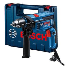Furadeira de Impacto 1/2 750W com Maleta GSB 13 RE Bosch Voltagem: 127V Furadeira de Impacto Bosch GSB 13 RE 750W em Maleta Plástica Vantagens: - A furadeira de impacto Bosch GSB 13 RE possui 750W de potência, é super leve e compacta Conta com menor vibração e menos ruído, além de uma carcaça reforçada de alta qualidade que aumenta a vida útil da ferramenta. Vem com empunhadura emborrachada para o agarre seguro e confortável, reduzindo a fadiga do usuário ao final do dia. Além disso, possui de velocidade variável e botão trava para trabalhos contínuos. - Uso com de 2 anos Bosch. Características: - Equipamento Heavy Duty; - Tipo de embalagem: Maleta plástica; - Fonte de energia: Cabo; - Comprimento do cabo: 2 m; - Acabamento do cabo: Borracha e cobre; - Acabamento da ferramenta: Poliamida, metal e elastômero; - Não possui controle de Torque; - Não possui fonte de luz; - Possui velocidade variável; - Possui Impacto; - Equipamento rolamentado; - Uso indicado: Perfurações em concreto, alvenaria, madeira e metal com e sem impacto; - Público Alvo: Pedreiros, marceneiros, carpinteiros, instaladores em geral, vidraceiros, oficinas de manutenção, serralheiros, eletricistas e calheiros. Dados Técnicos: - Cor: azul; - Tensão: 110 V ou 220 V não é bivolt ; - Potência da ferramenta: 750 w; - Nº de rotações sem carga : 0-3.800 rpm; - Torque Máx. duro : 1,8 Nm; - Tipo de mandril: com chave; - Mandril: 1/2 - 13 mm; - Impacto ipm = impacto por minuto : 0-57.000; - Diâmetro max. Perfuração madeira: 25 mm; - Diâmetro max, perfuração concreto broca maciça: 13 mm; - Diâmetro max. Perfuração concreto: 13 mm; - Diâmetro max. Perfuração aço: 10 mm; - Dimensões do produto AxLxP : 19,2 x 7 x 27,2 cm; - Peso: 1,8 kg. Vibração m/s : - Furar em metal: ah = 7,5 m/s; - K = 1,5 m/s; - Furar com Impacto em concreto: ah = 21,7 m/s; - K = 1,5 m/s. Ruído - Nível sonora: 94 dB A ; - Nível de potência sonora:105 dB A ; - Incerteza K = 3 dB. Componentes incluídos na embalagem: - 1 Furadeira de Impacto GSB 13 RE; - 1 manual de instruções; - 1 Chave de mandril; - 1 Empunhadeira auxiliar; - 1 limitador de profundidade; - 1 Maleta Plástica.