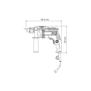 Corpo e botões injetados. Cabo elétrico de 2,0 m com plugue certificado pelo INMETRO. Sistema interno 100% rolamentado. Gatilho com velocidade reversível. Botão lateral para o travamento do gatilho. Mandril de 1/2 - 13 mm. Acompanha chave para aperto do mandril e manual de instruções. Possui cabo auxiliar com acessório para medir profundidade da furação. Seletor de operação: furação normal / furação com impacto. Rotação: 0 - 2800 min-1 / rpm. Impactos: 48000 ipm. Tensão: 127 V. Potência: 500 W. Frequência: 50/ 60 Hz.