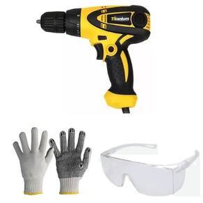 + Furadeira e Parafusadeira 3/8'' 300W Elétrica Titanium + Luva Malha p/ Pedreiro 3 fios Pigmentada 9" Worker + Óculos De Proteção Sky Wps0206 Para Proteção Deltaplus