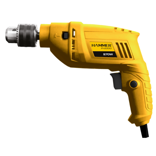 A furadeira FI-2000 possui função de impacto que permite furar diversos tipos de materiais e também uma trava que possibilita o seu uso de maneira contínua, sem a necessidade de pressionar o gatilho. Conta com uma rotação de 2800RPM e mandril de 3/8 (10mm).