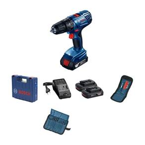 O kit acompanha 1 furadeira parafusadeira à bateria com impacto 18V Gsb 18v-50, 2 baterias Gba 18V 2.0Ah, 1 carregador Gal 18V-20 Professional e 1 maleta L-Case. O peso total, sem a bateria, é de 1,1kg.