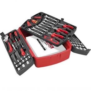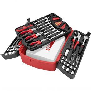 Acompanha: 1 maleta plástica com bandeja para ferramentas com 112 peças em aço carbono, sendo: