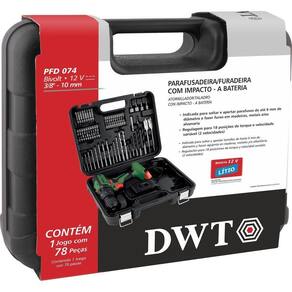 1 Parafusadeira /furadeira a bateria, acompanha: 1 maleta, 1 bateria de 12 V, 1 fonte bivolt automática e 74 acessórios, sendo: 5 brocas de madeira (10 mm, 8 mm, 6 mm, 5 mm e 4 mm), 8 brocas de aço rápido (6,5 mm, 6 mm, 5,5 mm, 5 mm, 4,5 mm, 4 mm, 3,5 mm e 3 mm), 5 brocas de alvenaria (10 mm, 8 mm, 6 mm, 5 mm e 4 mm), 2 brocas chatas para madeira (20 mm e 16 mm), 1 escareador, 8 bits 25 mm hexalobular (T10, T15, 2 peças T20, 2 peças T25, T30 e T40), 8 bits 25 mm fenda (2 peças SL 4 mm, 2 peças SL 5 mm, 2 peças SL 5,5mm e 2 peças SL 6,5 mm), 4 bits 25 mm allen (H3, H4, H5 e H6), 10 bits 25 mm pozidrive (2 peças PZ0, 2 peças PZ1, 3 peças PZ2 e 3 peças PZ3), 10 bits 25 mm philips (2 peças PH0, 2 peças PH1, 3 peças PH2 e 3 peças PH3), 2 bits 50 mm philips (PH2 e PH3), 2 bits 50 mm pozidrive (PZ2 e PZ3), 2 bits 50 mm hexalobular (T15 e T20), 2 bits 50 mm fenda (SL 5,5 e SL 6,5), 1 soquete magnético encaixe de 1/4 e 4 soquetes sextavados magnéticos (13 mm, 12 mm, 10 mm e 8 mm)