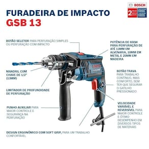 Furadeira impacto gsb 13 re bosch 650w + acess gsb13re Voltagem: 110v Furadeira de impacto e parafusadeira bosch gsb 13 re profissional sem maleta + kit x-line 30 peças -rendimento com eficiência e qualidade;-alta performance em todos os materiais;-potente motor de 650 w;-muito leve e compacta, com apenas 1,8 kg: facilita o trabalho em locais estreitos e de difícil acesso.-interruptor com velocidade variável, possibilita o controle de velocidade no gatilho para parafusar. Características:-botão-trava para trabalhos contínuos;-empunhadeira emborrachada: agarre seguro e confortável.-interruptor de velocidade variável. Dados técnicos:-potência absorvida: 650 w-nº de rotações sem carga : 0 - 3150 r.P.M.-potência útil: 301 w;-peso: 1.8 kg;-torque máx. Em materiais macios: 10,8 nm;-torque nominal: 1,8 nm;-mandril: 1/2- 20 unf;-amplitude de aperto, min./máx.: 1,5 - 13 mm-comprimento: 266 mm;-altura: 180 mm;-nº máx. De impactos em vazio: 0 - 47250 i.P.M. Faixa de perfuração: -diâmetro de perfuração em concreto: 13 mm-diâmetro de perfuração em madeira: 25 mm-diâmetro de perfuração em aço: 10 mm-diâmetro de perfuração em alvenaria: 15 mm Perfurar metal: -valor de emissão de vibrações ah: 3 m/s;-incerteza k: 1.5 m/s. Perfurar com percussão em concreto: -valor de emissão de vibrações ah: 26 m/s;-incerteza k: 3 m/s.Obs: não usar para furar, acima do indicado, ou quebrar paredes maciças de concreto,Nesse caso, é indicado o martelete. Parafusar: -valor de emissão de vibrações ah: 2.5 m/s;-incerteza k: 1.5 m/s. Acompanha: -limitador de profundidade;-mandril;-empunhadura lateral;-kit x-line 30 peças.