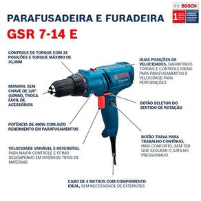 Modelo: Furadeira/Parafusadeira GSR Cor: Azul/Preta Funções: Sistema de electrónica / Rotação reversível direita/esquerda Potência do motor: 400 W Rotações nominais: 0 ¿ 450 r.p.m N° de rotações (sem carga): 0 ¿ 1.400 r.p.m Torque: 10,3 Nm Mandril sem chave: de 0,8 a 10 mm Aplicação: Madeira Peso: 1,6 Kg