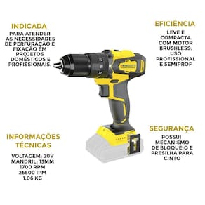 Furadeira parafusadeira menegotti mfi-20 20v + kit ferrament Furadeira de impacto e parafusadeira a bateria 20v intercambiável mfi-20v com motor brushless menegotti + baterias, carregador e jogo de brocas e bits Os modelos intercambiáveis da menegotti chegaram, trazendo muitas novidades. São ferramentas incríveis, com design exclusivo e tecnologia de última geração. As ferramentas intercambiáveis da menegotti contam com o motor brushless, aquele que não possui escova e possui baixo custo de manutenção. O que é intercambiável É a tecnologia que proporciona a troca de ferramentas, utilizando a mesma bateria. A furadeira e parafusadeira 20v com bateria intercambiável é uma ferramenta versátil e eficiente, projetada para atender às necessidades de perfuração e Fixação em projetos domésticos e profissionais. Com seu motor potente de 20v e bateria intercambiável, essa ferramenta oferece desempenho excepcional e Liberdade de movimento sem a restrição de cabos. Principais características: Cabo com revestimento emborrachado. Motor brushless, sem escova de carvão. Uso semiprofissional, . 3 modos de uso: furar, parafusar e martelete. Dados técnicos: Bateria intercambiável: 20v - lítio - bivolt; Possui led: sim; Torque máximo: 45 n.M; Mandril de encaixe: 1/2; Velocidade mecânica: 0-1700 rpm; Taxa de impacto: 0 - 25500 ipm; Peso: 1,06kg; Motor: brushless; Posição de torque: 21+3; Dimensões c x l x a : : 6 meses; Capacidade de perfuração: Madeira: 20mm; Aço: 13mm; Concreto: 13mm. Itens que acompanham a máquina: - 01 presilha para cinto; - 02 baterias 20v de 2,0ah; - 01 carregador; - 01 jogo x-line de 33 peças: Jogo x-line bosch 33 peças :: 7 brocas para metal hss-r de 2/3/3/3,2/4/4,2/5 mm :: 5 brocas para pedra de 4/5/6/7/8 mm :: 6 brocas para madeira de 3/4/5/6/7/8 mm :: 10 bits, c = 25 mm, ph 1/2/3, pz 1/2, sl 4/6/7, t 20/25 :: 1 suporte universal magnético :: 3 chaves de caixa para parafusos sextavados 7/8/10 mm :: 1 escareador Ean: 7909463118938
