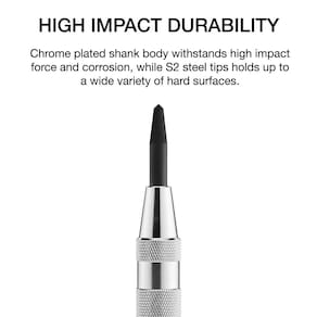 NEIKO Furador central automático 02639A de 15 cm com impacto de mola ajustável com uma mão, haste cromada e ponta de aço S2 premium - Ferramenta de perfuração: este furador central automático de 15 cm é o dispositivo de perfuração de centralização perfeito para ajudar a iniciar parafusos e perfurar furos. Alinhe a ponta deste furador de metal em uma variedade de superfícies duras para criar orifícios centrais para fixadores. - Ferramenta de perfuração ajustável: o design de perfuração central com mola usa tensão de mola que pode ser modificada e ajustada para marcação, perfuração ou estaqueamento leves ou pesados. Mude a força de ataque a qualquer momento para combinar com a superfície com a qual você está trabalhando. - Materiais de qualidade: com um corpo de haste cromada e uma ponta de aço S2 endurecido, esta ferramenta de perfuração de madeira e metal resistente à corrosão pode suportar perfurações e força de alto impacto. A tampa serrilhada antiderrapante dá a você uma aderência firme com uma mão na ferramenta. - Fácil de usar com uma mão: este perfurador central automático com uma mão precisa apenas de suas mãos — não é necessário martelo. Use a ponta S2 em uma superfície resistente para centralizar onde você deseja o orifício de partida e perfure a ferramenta para baixo para criar o marcador de broca. - Tamanho compacto: este perfurador automático com uma mão é pequeno o suficiente para caber em qualquer caixa de ferramentas ou bolso. Carregue com você de trabalho para trabalho para uma broca de partida conveniente e fácil. Você também pode usá-lo como um quebra-vidro com mola para emergências.