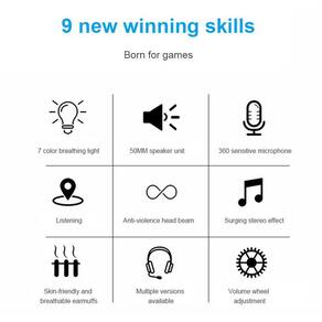 1. O design leve: confortável e fácil de usar, então você dificilmente pode sentir o peso de sua cabeça ao jogar jogos, e você pode jogar facilmente 2. O design de protetores auriculares totalmente fechados pode isolar o ruído externo de forma eficaz e não machucará seus ouvidos por um longo tempo. 3. Controle de volume de ajuste humanizado e conveniente, ajuste em tempo real, controle fácil. 4. Microfone de redução de ruído, alta sensibilidade do microfone omnidirecional de redução de ruído, resposta de frequência mais ampla, pode reduzir muito o ruído de fundo. 5. Efeito de iluminação colorido: A luz LED de respiração de 7 cores lhe trará jogos mais emocionantes e atmosfera musical.