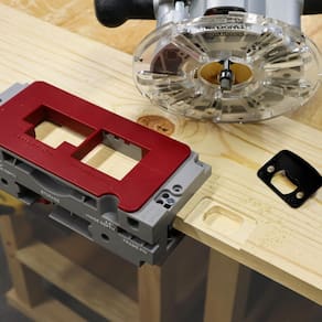 - O design exclusivo do gabarito de instalação de dobradiças de porta elimina a necessidade de vários insertos para rotear diferentes raios de canto