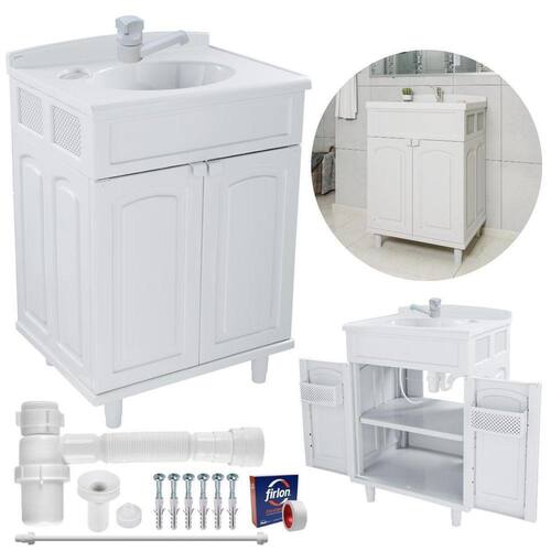 Gabinete 02 portas para banheiro com lavatório + torneira + fita veda rosca Gabinete para banheiro com lavatório branco 02 portas astra