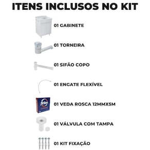 01 gabinete 01 torneira plástica 01 rolo de fita veda rosca 12mm x 5m 01 válvula com tampa 01 sifão com copo 01 engate 06 buchas s10 06 parafusos 3,5 x 55mm 04 pés Ean: 7894141403171
