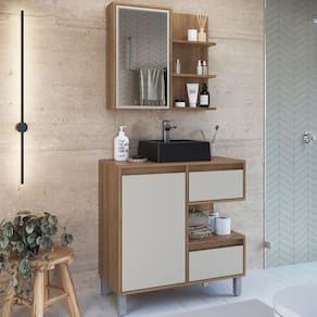 Transforme seu ambiente com o Conjunto Gabinete e Espelheira CJ2001 com Cuba Preta da Milani Store. Esta Espelheira vem com uma porta espelhada, e possui duas prateleiras internas: Espaço para manter seus itens sempre organizados. O Gabinete tem uma porta, duas gavetas e nichos externos que proporcionam espaço para armazenar e acessar seus produtos com facilidade. Além disso, vem acompanhado de uma cuba em mármore sintético e pés em ABS reguláveis. A furação para instalação da válvula da cuba deve ser realizada durante a montagem. Este móvel chegará na sua casa separado em 03 volumes.