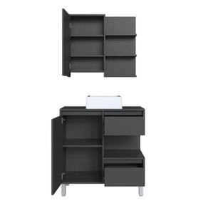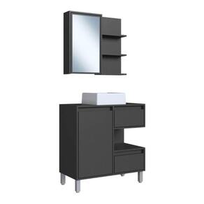 O conjunto para banheiro CJ2001 é produzido em MDP 15mm e acabamento FF fosco. O gabinete possui 1 porta de bater com dobradiça metálica, 1 prateleira interna, 2 gavetas com corrediças metálicas, 4 pés em ABS com altura de 13cm e 1 nicho aberto. Já a espelheira possui 1 porta de bater com espelho 3mm colado, dobradiça metálica, 2 prateleira internas e 2 prateleiras externas. Produto suporta até 45kgs. Conteúdo da embalagem: móvel, ferragens e manual de montagem. A fixação das peças e/ou acessórios é feita por parafusos e cavilhas. Para uma limpeza mais efetiva, utilizar apenas pano macio umedecido e sabão neutro. Não utilizar produtos abrasivos. Garantia de 03 meses contra defeitos de fabricação. Medidas do produto gabinete (AxLxP): 83x80x40cm. Medidas do produto espelheira (AxLxP): 63,5x70,3x14cm. Peso total do produto: 38,11kgs. Produto acompanha cuba branca em mármore sintético.