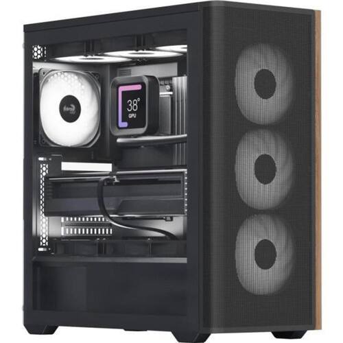 Gabinete Aerocool D501-V1 Preto O Gabinete Aerocool D501-V1 oferece um design moderno com painel frontal de malha e detalhes em madeira, combinando estilo e funcionalidade. Com espaço para até 11 ventoinhas e suporte para refrigeradores líquidos de até 360 mm, ele garante excelente resfriamento para configurações poderosas.