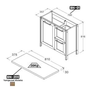 - Tampo em MDP 30 mm padrão Riviera (tonalidade de cor bege) que suporta até 30 kg.