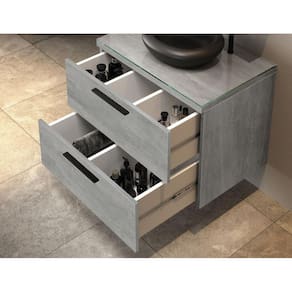 O gabinete possui tampo de vidro de 8mm de espessura que da beleza e maior resistência ao seu produto, puxadores em metal, gavetas com corrediças telescópicas e sistema Slow de fechamento suave, também possui divisórias internas que facilitam a organização de seu banheiro, conta com uma cuba de Louça que dá maior sofisticação.