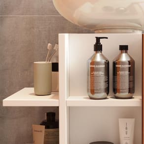 Organização e Praticidade: As prateleiras internas e a porta articulada ajudam a manter o banheiro organizado e funcional.