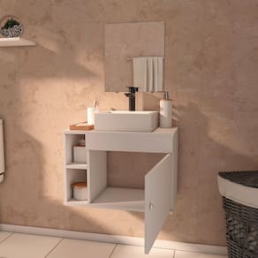 O Gabinete de Banheiro 60cm oferece uma solução prática e elegante para organizar itens de higiene. Composto por nichos, uma porta e uma cuba, ele otimiza o espaço com estilo e funcionalidade. Seu design moderno se adapta a diferentes tipos de decoração, tornando-o ideal para banheiros compactos ou amplos. Além de acompanhar um kit de montagem, o gabinete é resistente e fácil de instalar, proporcionando praticidade no dia a dia. Combinando com diversos estilos de ambientes, ele é a escolha perfeita para quem busca beleza e organização em um só produto. Acabamento da Porta: BP Acabamento da Prateleira: BP Altura do Espelho: 41 cm Ambiente Principal: Banheiro Complexidade da Montagem: Média: pode ser montado por mais de uma pessoa e/ou necessite de maior conhecimento para montagem Cor: Branco Cor do Produto: Branco Cor Interna: Branco Escala de Brilho: Brilhante Escala de Brilho da Porta: Brilhante Escala de Brilho da Prateleira: Brilhante Espessura do Espelho: 4 mm Formato do Espelho: Quadrado Itens Inclusos: Cuba, espelho, kit de montagem e manual Largura do Espelho: 28 cm Linha ou Coleção: Itália Manual de Montagem e Instalação: https://product-hub-prd.madeiramadeira.com.br/950010/documents/a0e99038-9dd5-430b-8918-2b25d7908875235235058811726692686696.pdf Material da Porta: MDP Material da Prateleira: MDP Material do Puxador da Porta: ABS Material Principal: MDP Necessita Montagem: Sim Origem do Produto: Nacional Peso: 11 kg Peso Máximo por Prateleira: 5 kg Possui Espelho: Sim Possui Pés: Não Possui Portas: 01 Possui Prateleiras: 01 Recomendações de Uso, Manutenção e Limpeza: Limpeza Regular: Utilize um pano macio levemente umedecido com água e sabão neutro para limpar o gabinete. Evite Produtos Abrasivos: Não utilize produtos de limpeza abrasivos, solventes ou produtos químicos agressivos, pois podem danificar o acabamento do MDP. Secagem Adequada: Após a limpeza, seque imediatamente o gabinete com um pano seco para evitar que a umidade se acumule na superfície. Sistema de Montagem: Parafusos e Cavilha Suporta Até (kg): 30 kg Tipo de Dobradiça/Corrediça da Porta: Aço Tipo de Fixação do Espelho: Botão Francês Tipo de Porta: Bater Tipo de Puxador da Porta: Externo Marca: Brovalia