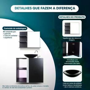 Produto de madeira MDP 15mm com revestimento de maior resistência e durabilidade, na cor Preto. A Cuba é em Resina de Poliéster na cor Preto, material robusto, brilhante e de excelente acabamento, não é mármore sintético e nem plástico. Muito linda e elegante.