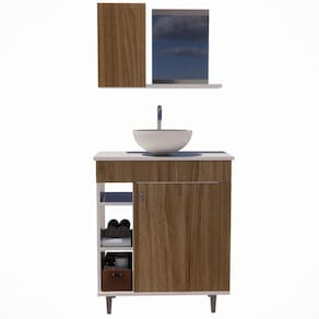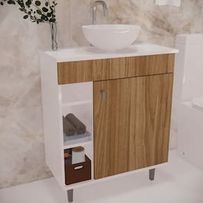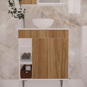 Gabinete de banheiro com pés e cuba, perfeito para otimizar e organizar seu espaço com estilo. Ideal para armazenar produtos de higiene pessoal, oferece praticidade e design funcional. Com estrutura robusta, é fácil de instalar e se adapta a diversos tamanhos de banheiros. Sua cuba é moderna e compacta, garantindo sofisticação ao ambiente. Combina perfeitamente com decorações contemporâneas, tornando-se uma solução elegante para banheiros residenciais ou comerciais. Acabamento da Porta: BP Acabamento da Prateleira: BP Acabamento dos Pés: Polipropileno Altura dos Pés: 15 cm Ambiente Principal: Banheiro Complexidade da Montagem: Média: pode ser montado por mais de uma pessoa e/ou necessite de maior conhecimento para montagem Cor: Branco/Marrom Cor do Produto: Branco/Marrom Cor Interna: Branco Escala de Brilho: Brilhante Escala de Brilho da Porta: Brilhante Escala de Brilho da Prateleira: Brilhante Itens Inclusos: 1 Armário + 1 Cuba , Kit Montagem e Manual de Montagem Linha ou Coleção: Itália Com Pés Manual de Montagem e Instalação: https://product-hub-prd.madeiramadeira.com.br/950020/documents/8c966902-82ca-4c80-b8b7-a1e678dc2dc02358652588117267712891413.pdf Marca: Brovalia Material da Porta: MDP Material da Prateleira: MDP Material do Puxador da Porta: ABS Material dos Pés: ABS Material Principal: MDP Necessita Montagem: Sim Origem do Produto: Nacional Pés Reguláveis: Sim Peso: 14 kg Peso Máximo por Prateleira: 5 kg Possui Espelho: Não Possui Pés: 04 Possui Portas: 01 Possui Prateleiras: 03 Possui Rodízio: Não Recomendações de Uso, Manutenção e Limpeza: Limpeza Regular: Utilize um pano macio levemente umedecido com água e sabão neutro para limpar o gabinete. Evite Produtos Abrasivos: Não utilize produtos de limpeza abrasivos, solventes ou produtos químicos agressivos, pois podem danificar o acabamento do MDP. Secagem Adequada: Após a limpeza, seque imediatamente o gabinete com um pano seco para evitar que a umidade se acumule na superfície. Sapatas Niveladoras: Não Sistema de Montagem: Parafusos e Cavilha Suporta Até (kg): 30 kg Tipo de Dobradiça/Corrediça da Porta: Aço Tipo de Porta: Bater Tipo de Puxador da Porta: Externo Marca: Brovalia