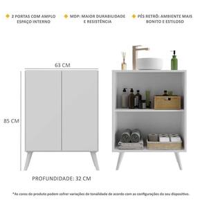 O Gabinete Banheiro 2 Portas Retrô 63cm Multimóveis é produzido em MDP com acabamento acetinado (cerca de 20% de brilho), que garante maior durabilidade, facilidade na limpeza, além de um acabamento superior. Com 2 portas, possui um excelente espaço interno para organizar itens de higiene, toalhas e demais objetos (a prateleira interna suporta 8 Kg e o tampo 9 Kg). Os pés retrô, em polipropileno, dão um charme especial ao móvel deixando-o com um visual leve e permitindo você compor um ambiente com ar vintage e moderno ao mesmo tempo. Uma ótima opção para deixar seu banheiro bonito, prático e organizado. Não acompanha torneira e cuba.