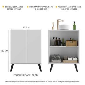 O Gabinete Banheiro 2 Portas Retrô 63cm Multimóveis é produzido em MDP com acabamento acetinado (cerca de 20% de brilho), que garante maior durabilidade, facilidade na limpeza, além de um acabamento superior. Com 2 portas, possui um excelente espaço interno para organizar itens de higiene, toalhas e demais objetos (a prateleira interna suporta 8 Kg e o tampo 9 Kg). Os pés retrô, em polipropileno, dão um charme especial ao móvel deixando-o com um visual leve e permitindo você compor um ambiente com ar vintage e moderno ao mesmo tempo. Uma ótima opção para deixar seu banheiro bonito, prático e organizado. Não acompanha torneira e cuba.