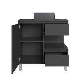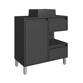 O gabinete para banheiro BL2001 é produzido em MDP 15mm e acabamento FF fosco. Possui 1 porta de bater com dobradiça metálica, 1 prateleira interna, 2 gavetas com corrediças metálicas, 4 pés em ABS com altura de 13cm e 1 nicho aberto. Estrututa do fundo em 3mm. Produto suporta até 45kgs. Conteúdo da embalagem: móvel, ferragens e manual de montagem. A fixação das peças e/ou acessórios é feita por parafusos e cavilhas. Para uma limpeza mais efetiva, utilizar apenas pano macio umedecido e sabão neutro. Não utilizar produtos abrasivos. Garantia de 03 meses contra defeitos de fabricação. Medidas do produto (AxLxP): 83x80x40cm. Peso do produto: 27,39kgs. Produto acompanha cuba preta em mármore sintético.