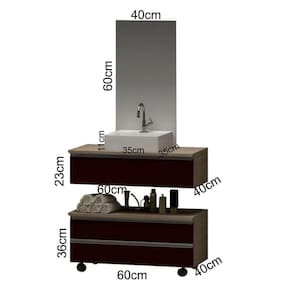 DIFERENCIAIS: Móvel de rodinha pode ser retirado quando for lavar banheiro, facilitando o processo. Acabamento da Cuba: Gel Acabamento da Gaveta: Acetinado Acabamento da Porta: Laca Acompanha Cuba: Sim Acompanha Tampo: Sim Ambiente Principal: Banheiro Cor: Madeirado/Vermelho Cor da Cuba: Branco Cor do Produto: Madeirado/Vermelho Cor Interna: Madeirado Escala de Brilho: Acetinado Escala de Brilho da Gaveta: Semi-Brilho Escala de Brilho da Porta: Brilhante Espessura do Espelho: 3 Formato do Espelho: Retangular Furação para Cuba e Torneira: Sim Gaveta com Chave: Não Itens Inclusos: 1 Gabinete, 1 Cuba, 1 Espelheira, Kit Fixação e Manual de Instalação Linha ou Coleção: Creta Manual de Montagem e Instalação: https://cdn2.madeiramadeira.com.br/atributo/fabrica-de-gaiolas-joia/1196701-1196036-dicas-para-instalacao.pdf Material da Cuba: Mármore Sintético Material da Gaveta: MDF/MDP Material da Porta: MDP Material do Tampo: MDF/MDP Material Principal: MDF/MDP Medida da Cuba (C x L x P): 35cm x 35cm x 11cm Medida da Espelheira (A x L x P): 60x40x2 Medida do Gabinete (A x L x P): 60x60x40cm Necessita Montagem: Não Origem do Produto: Nacional Peso: 30 Peso Máximo por Gaveta: 20 Peso Máximo por Prateleira: kg Possui Espelheira: Sim Possui Gabinete: Sim Possui Gavetas: 02 Possui iluminação: Não Possui Pés: Não Possui Portas: 01 Possui Rodízio: Sim Recomendações de Uso, Manutenção e Limpeza: Produto vai montado, é necessário somente fixar na parede e realizar ligações hidráulicas Rodízio com Trava: Não Tamanho do Espelho (A x L): 60x40cm Tipo de Corrediça da Gaveta: Metálica Telescópica Tipo de Dobradiça/Corrediça da Porta: Metálica Tipo de Gabinete: Gabinete Suspenso Tipo de Porta: Misto (Bater e Basculante) Tipo de Puxador da Gaveta: Embutido Tipo de Puxador da Porta: Externo Marca: Gabinetes Joia